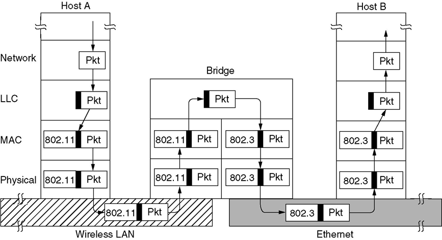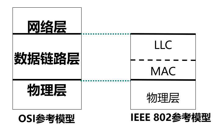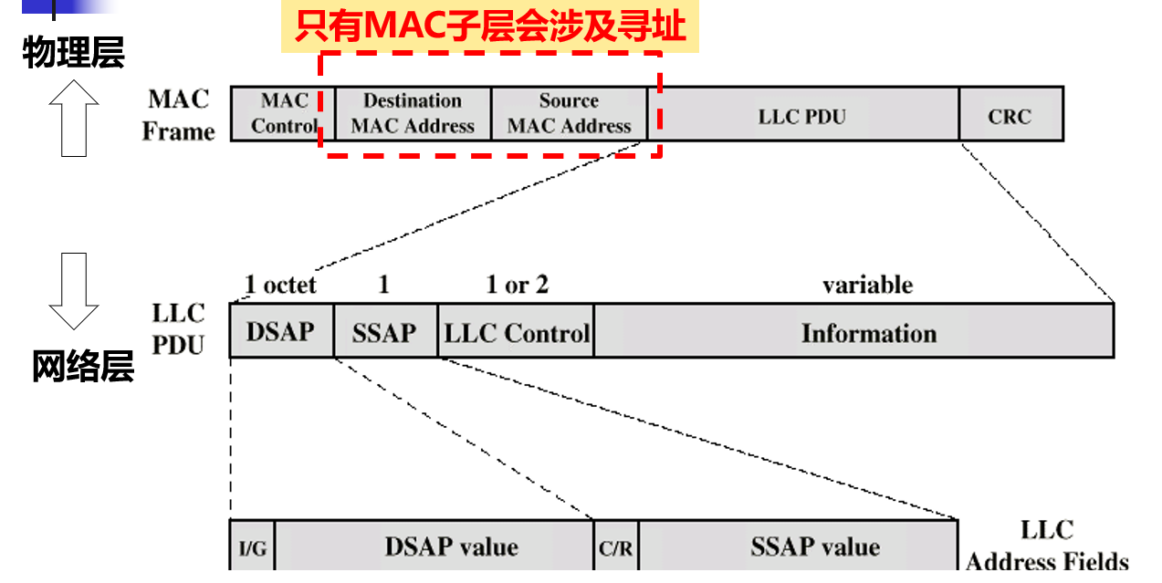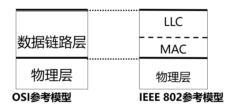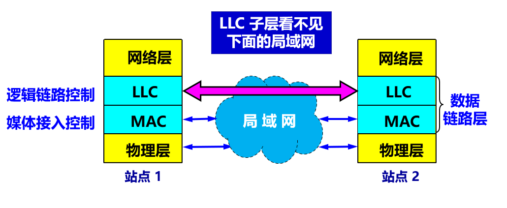 • 对于相同的 LLC 子层, 可以提供不同的 MAC 子层. 例如, 常用以太网, 802.11 无线局域网等局域网具有相同的 LLC 子层, 只是 MAC 子层不同.