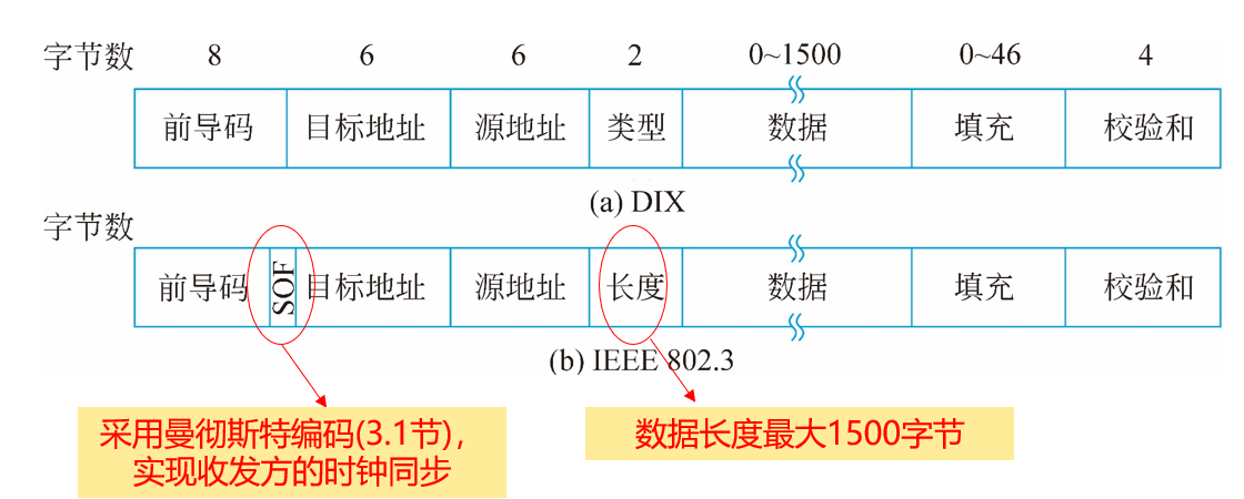 • 成帧: 在接收方从比特流中恢复出帧, 关键在于确定帧开始和结束的地方, 即帧定界