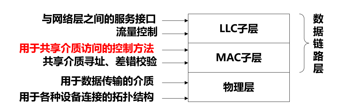 • 在传统链路控制 (如点对点通信的串行链路) 中, 没有管理访问共享 (广播式) 介质的逻辑需求 , MAC 子层负责对共享介质的访问进行控制