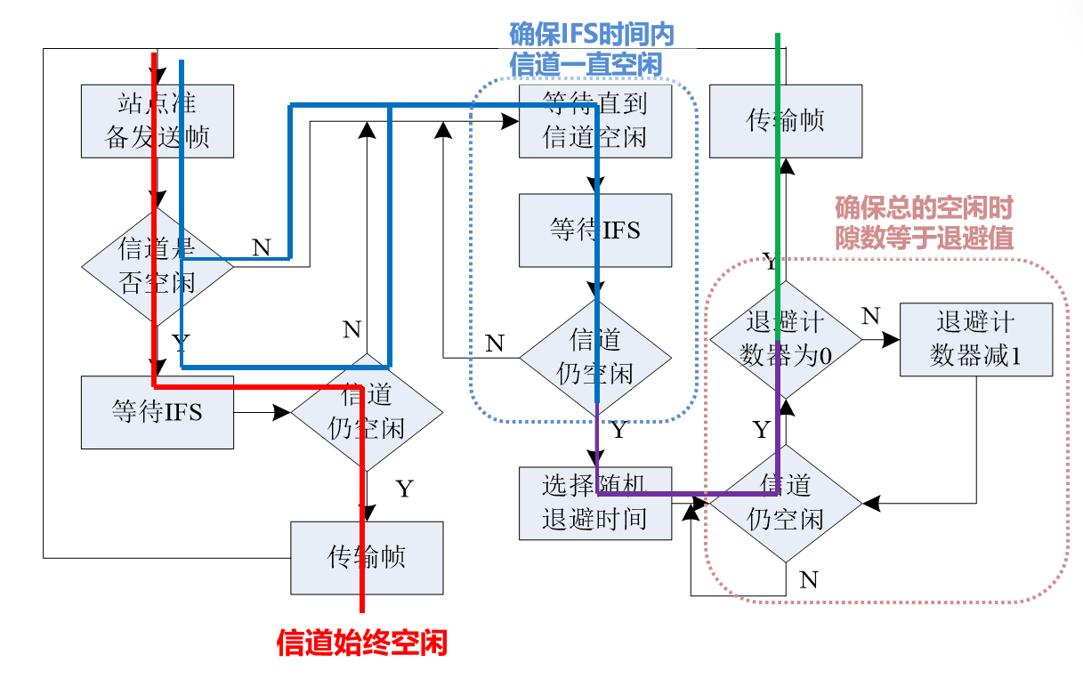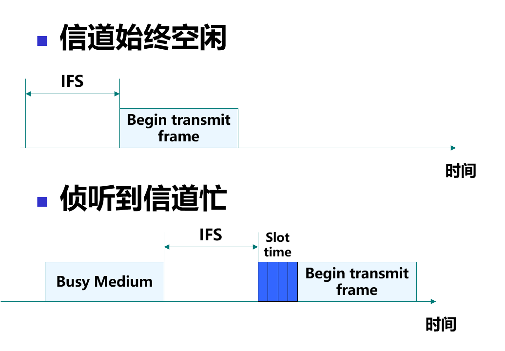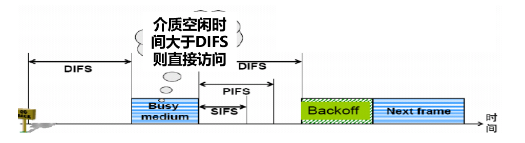 • 载波侦听: 发送帧之前侦听无线信道是否空闲, 若是则进入冲突避免阶段, 若否则延迟直到信道空闲