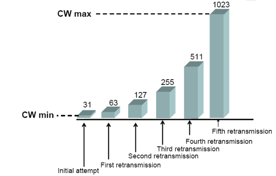 • CW 从CWmin\mathrm{CW}_{min}开始, 每次重传都将 CW 加倍, 直到到达CWmax\mathrm {CW}_{max}.