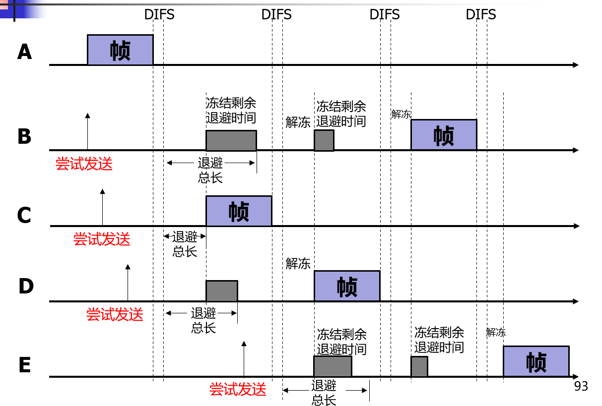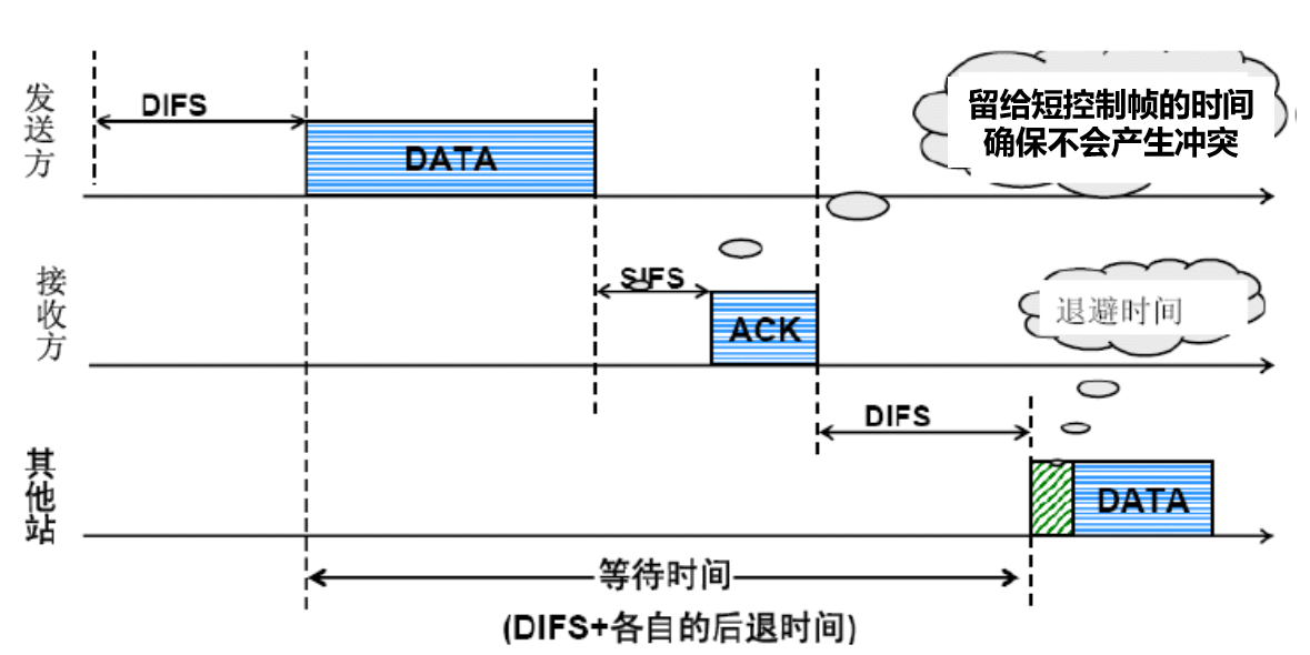 • ACK 帧不需要执行随机退避算法, 而是直接等待一个 SIFS 时间后就发送 .