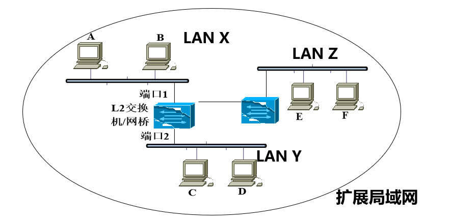 扩展局域网 (Extended LAN): 一个或者多个网桥或者交换机连接的局域网集合.