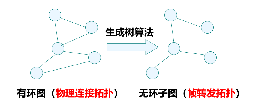 生成树算法的思想: 将扩展局域网看作是有环的图, 图的顶点表示网桥或者交换机, 图的边表示它们之间不仅直接相连, 而且还可以转发帧, 那么生成树就是覆盖这个图的所有顶点的无环子图 (用于帧转发) .