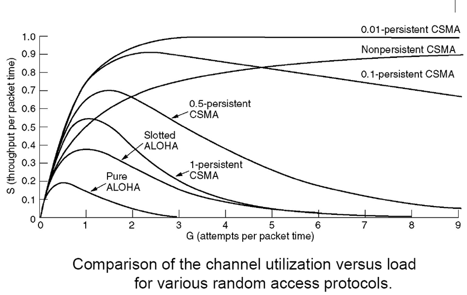 • 随机访问 (争用 contention): 只要有数据就可以发送, 发生冲突后再采取措施解决冲突, 适用于负载轻的网络, 负载重时效率低, 如ALOHA, CSMA.