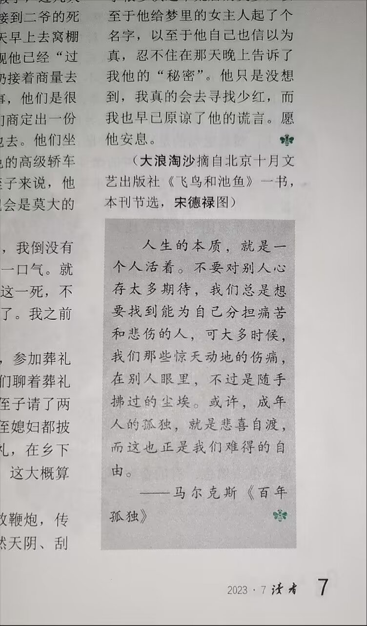 能写出这种玩意的绝对百年孤独根本没翻开过, 你跟我说这是摘自阿弥陀佛么么哒我大概能信, 那么这本显然毫无校对且编辑毫无文学素养的杂志是什么呢?