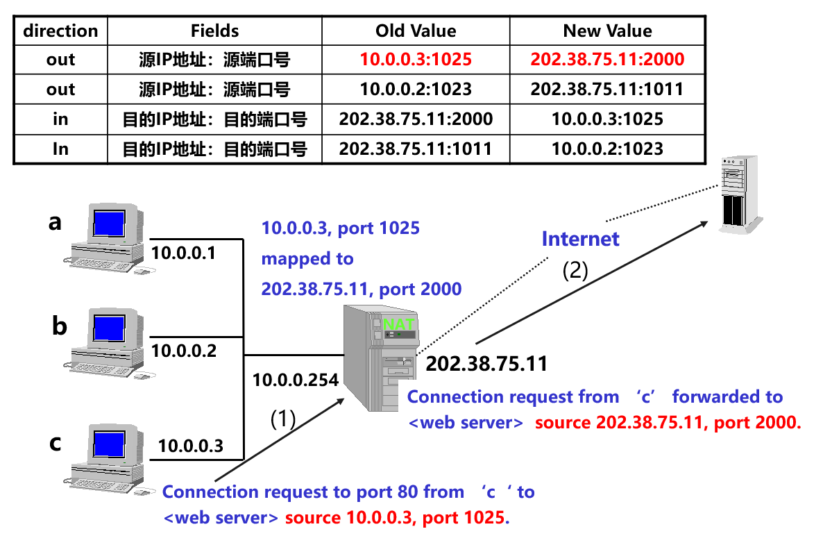解决方法: 使用 TCP 或者 UDP 端口号来区分, 也就是说 NAT 的依据不再仅仅是 IP 地址, 还包括端口号 (IP 地址+端口).