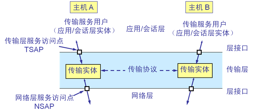 • 实现运行在不同主机上的进程之间的通信: 每个应用进程都至少与一个传输层地址 (端口) 相关联