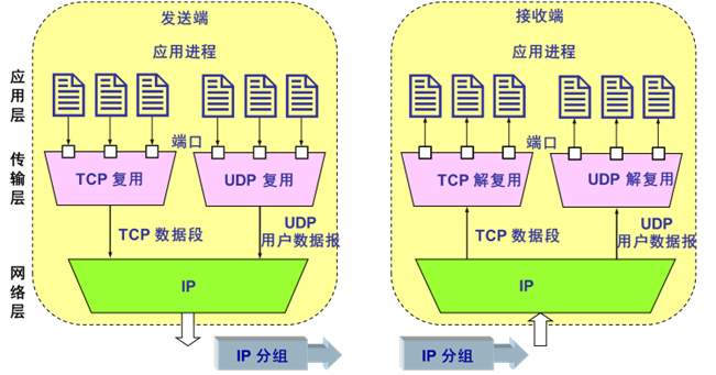 • 传输层根据接收到的 TCP/UDP 协议数据单元中包含的端口信息将其递交给与该端口关联的网络应用进程
